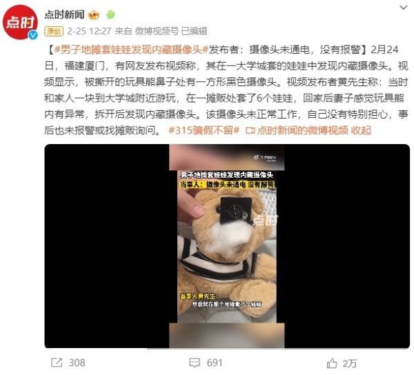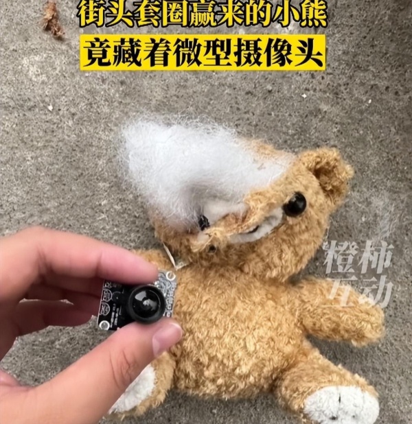导读:3月23日,湖南永州女生小何发现在公园地摊上套中的玩具熊内装有微型摄像头。小何称还好一直对着天花板,事后觉得很恐怖,现已将摄像头扔掉。