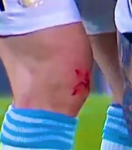 比赛第16分钟,梅西带球被放倒。镜头显示,梅西膝盖流血了