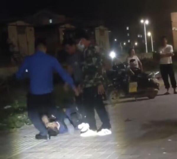 据网友22日凌晨3时许发布的视频显示,一名倒在地上的男子,双手抱着一名身穿制服男子的左腿。双方僵持了一会后,两名男子上前掰倒地男子的胳膊,这时制服男子用脚连续踢踹倒地者的头部。后来民警和120救护车都来到了现场。