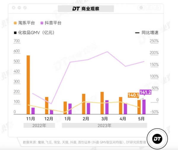 抖音与淘宝之间的在美妆领域上的差距正在缩小,而且一度短暂超越淘宝。根据首创证券去年发布的《美妆:5月抖音销售增势不减,国货品牌延续分化》报告,2023年5月,抖音化妆品GMV首次超过淘宝天猫。