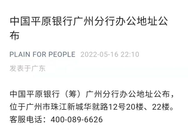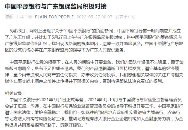 在被银保监局曝光后,“中国平原银行”于5月27日凌晨在微信公众号上发布公告,称将成立广东工作组,于27日上午向银保监局汇报,沟通消除误会。在公告中,“中国平原银行”自称未造成人民财产的任何损失,亦未收到任何投诉。
