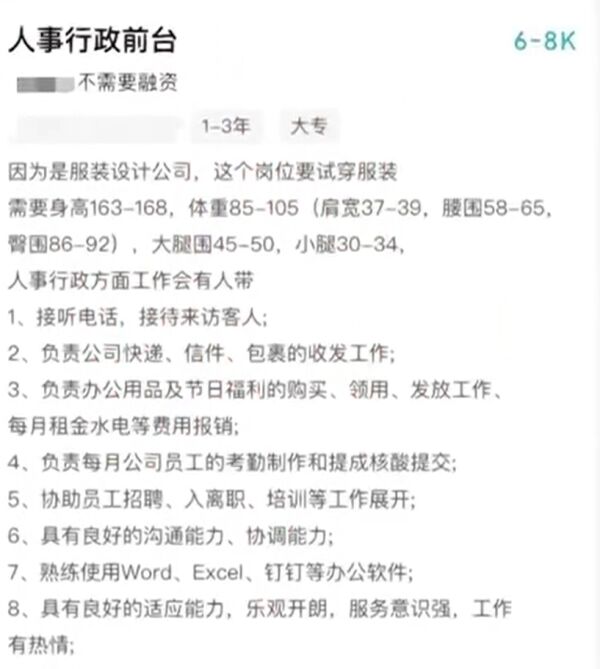 随后,该公司工作人员回应称,此岗位需试穿设计师设计的新版衣服,故对身材有统一标准,但主要工作还是人事行政前台。