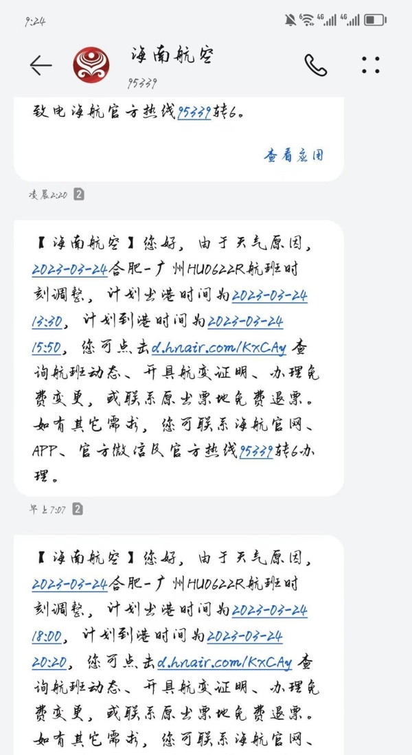 小刘提供给记者的机票及延误短信显示,其从合肥新桥机场出发至广州白云机场的航班,在23日被多次提示延误。“早上先是从9点延误到10点,后来又延误到下午3点,后来说是5点,最后一直陆陆续续延误到晚上12点后取消了。我当时也查过去广州的其他方式,但几乎所有方案都来不及。”小刘告诉记者,直到确认自己无法赶得上复试后,自己崩溃得在机场大哭,“觉得对不起父母,也对不起自己的努力。”