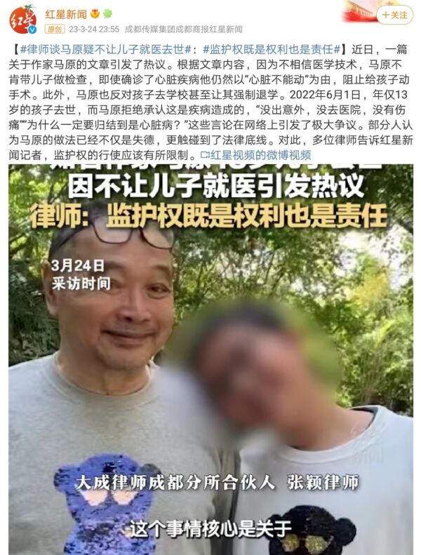 导读:近日,“马原疑不让儿子就医去世”引发热议。2022年6月,马原13岁的孩子去世,其拒绝承认与疾病有关。对此,多位律师表示,监护权的行使应该有所限制。