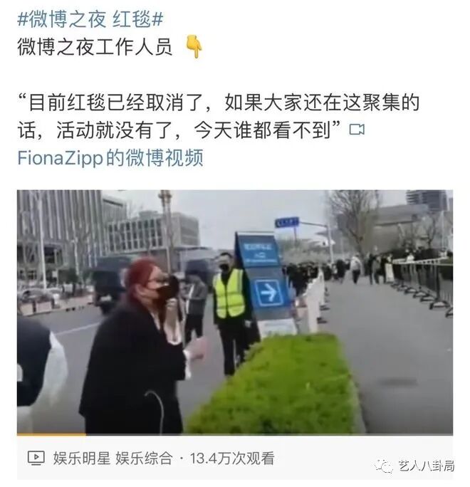 主办方的工作人员拿着喇叭,在红毯外喊话:“目前红毯已经取消了,如果大家还在这里聚集的话,那么今晚的活动也没有了,谁也看不到。”几乎已经用上了威胁的语气。