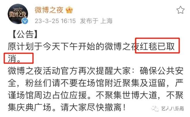 千等万等,最后等来了微博之夜官方发出公告,公告字数很简短,但内容很震撼。官方表示:红毯取消!因为过多粉丝聚集逗留,请大家尽快撤离。