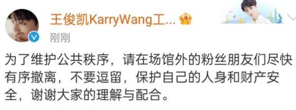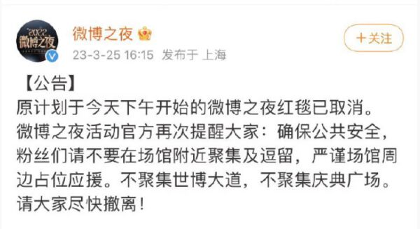 微博之夜的官方账号还特意写了一篇公告,希望在现场的粉丝们保护好自己的安全,不要聚集及逗留,望他们及时撤离。