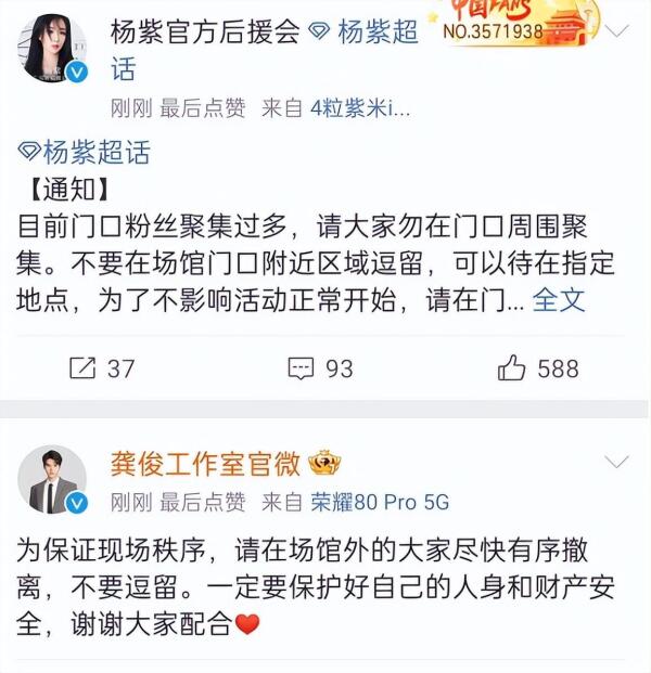 王俊凯、杨紫、龚俊等人的工作室及后援会还专门发文提醒大家,红毯都走了一半才通知取消,不少人都猜测难道是提前没有安排好流程,又或者是粉丝们的聚集才迫使红毯急忙取消吗?