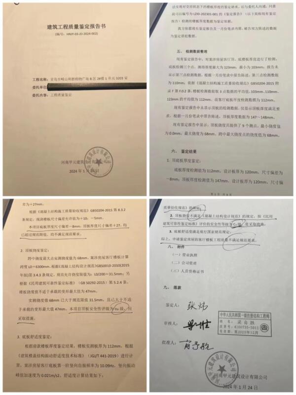 “我们也找建筑领域的朋友了解了,说这已经是建筑质量方面的问题,比较严重。”崔女士说,鉴于这种情况,他们只好叫停了装修,并委托专业机构对房子的屋顶进行了安全性鉴定,鉴定结果显示,该套房子的上下楼板厚度偏差均超过规范限值,均不满足规范要求。而实测顶板挠度值大于规范限值,且已大于不适于承载的变形最大值,顶板安全性评级为cu级(房屋鉴定中将房屋的等级划分为A、B、C、D级四个等级,Au、Bu、Cu、Du级为楼层危险性等级,Cu级是指部分承重结构承载力不能满足正常使用要求,局部出现险情,构成局部危房。),应采取措施。那么既然崔女士所购房屋的顶板底板都不满足规范要求,楼上楼下是否也发现了问题呢?崔女士说,楼上楼下的房子好像还没卖出去,“我们也进不去”。