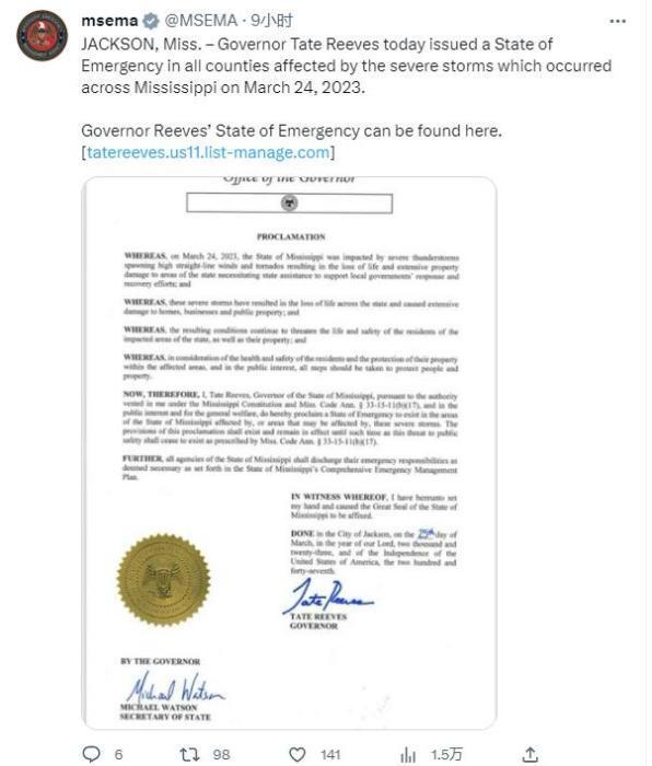 图片来源:密西西比州紧急事务管理局社交媒体账号截图