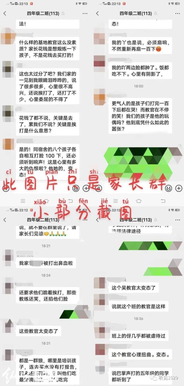 一张网传的名为“四年级二班”微信群截图显示,有多名家长反映孩子被教官要求互扇耳光。一名家长透露:“同宿舍的八个孩子互相打脸100下,还必须听到响声。”另一名家长称,他的孩子说,教官要求必须扇响,不然得重新再扇100下,有孩子当时被打出鼻血。