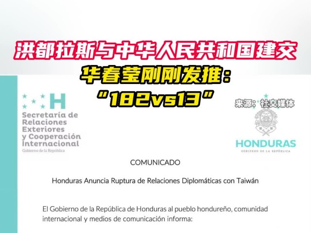 【环球网报道】3月26日,中国同洪都拉斯签署《中华人民共和国和洪都拉斯共和国关于建立外交关系的联合公报》。两国政府决定自公报签署之日起相互承认并建立大使级外交关系。中国外交部部长助理华春莹随后在推特上发文称,“182vs13:这是全球民心所向,也是历史大势所趋”。