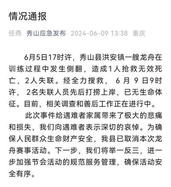 重庆市秀山土家族苗族自治县应急局发布通报称,6月5日下午5时许,秀山县洪安镇一艘龙舟在训练过程中发生侧翻,造成1人抢救无效死亡,2人失联。经全力搜救,6月9日9时许,2名失联人员先后打捞上岸,已无生命体征。目前,相关调查和善后工作正在进行,秀山县已取消本次龙舟赛事活动。