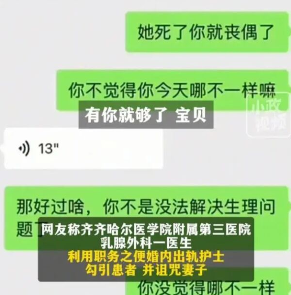 越闹越大!黑龙江齐齐哈尔,男子在网上公开举报一男医生,利用职务之便,出轨女护士在病房做不正当男女行为,勾引女患者,还诅咒妻子,聊天记录的曝光,也是尺度很大,相当露骨,目前,医院已经介入调查此事
