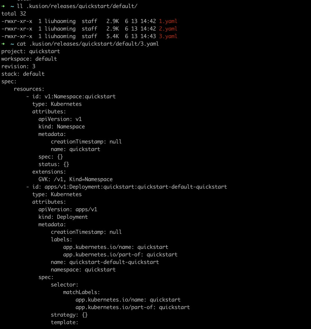在之前的版本中,当一个应用 Stack 被 apply 或 destroy 后,Kusion 会在存储后端中创建/更新 State 文件,以记录应用资源的状态信息。在这个版本中,我们将 State 文件升级为了 Release ,用于记录应用 Stack 的元数据、资源 Spec 、State ,以及运维操作 Phase ,从而能更好地适应团队协作与审计管理的需要。