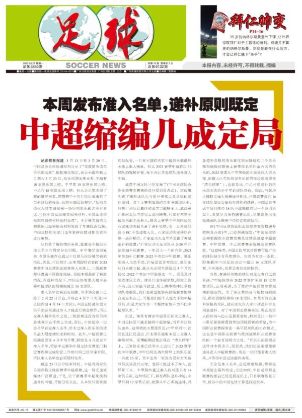 从目前了解的情况来看,就算是中超俱乐部也至少有两家存在问题,中甲情况也很复杂,有俱乐部存在超过十位球员投诉被欠薪的情况。因此,可以预计,在本周即将官宣的2023赛季中国足球职业联赛准入名单上,三级联赛都将遭遇不同程度残缺。而据本报最新了解的情况,在这种情况下,中国足协有很大概率会将中超球队的规模缩减至16支球队。