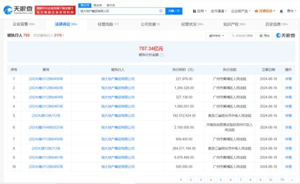 天眼风险信息显示,恒大地产集团有限公司现存780余条被执行人信息,被执行总金额超707亿元,此外该公司还存在多条限制消费令、失信被执行人(老赖)和终本案件信息。