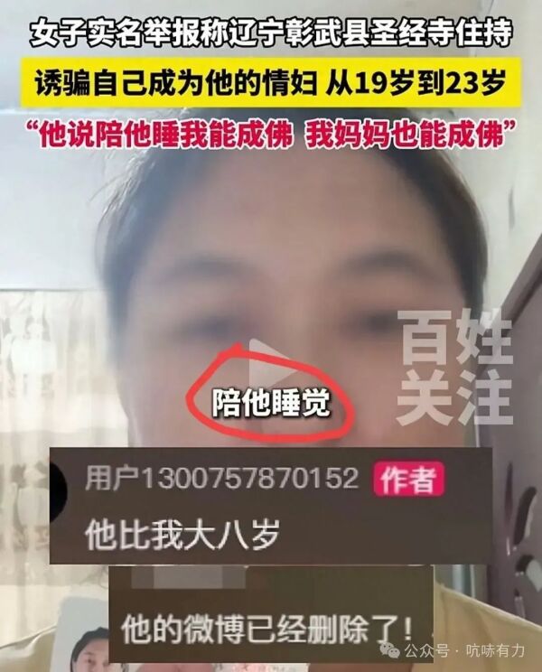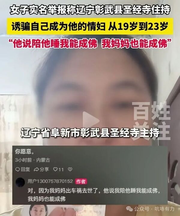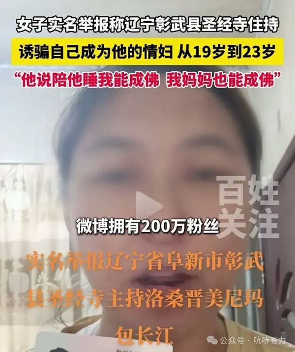 6月21日,又有一个佛门住持出事了,一名女子在网上实名举报辽宁省阜新市彰武县圣经寺住持包长江。