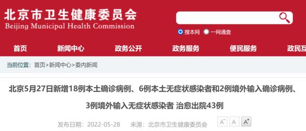 据北京卫健委网站消息,5月27日0时至24时,新增18例本土确诊病例(含1例无症状感染者转确诊病例)和6例无症状感染者,无新增疑似病例;新增2例境外输入确诊病例和3例无症状感染者,无新增疑似病例。治愈出院43例。