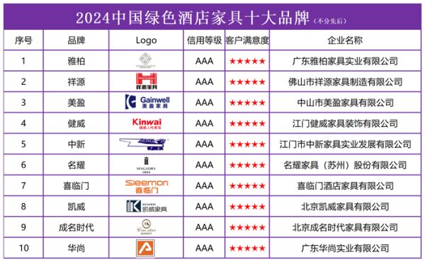“2024中国绿色酒店家具十大品牌”榜单(不分先后)