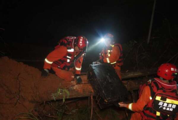 深圳消防攻坚小组在梅州市平远县泗水镇文贵村富炉石灾害事故点营救被埋压人员。广东消防供图