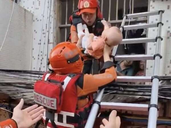 梅州市梅县区松口镇石盘村,6名消防救援人员合力救出一名6个月大的婴儿。广东消防供图