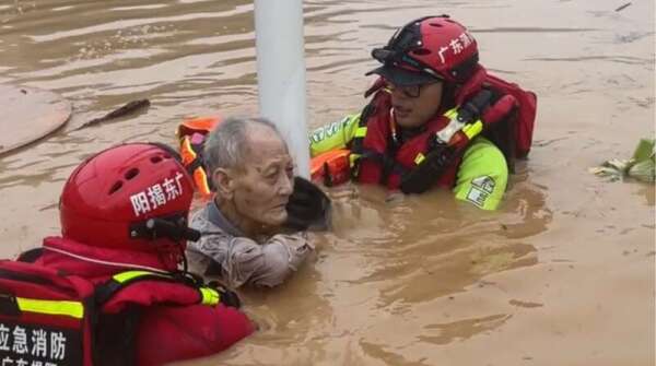 揭阳市消防救援支队队员救下一名被困在洪水中、紧抱路灯杆的老人。广东消防供图