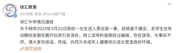 据上海市徐汇区教育局官方微博@徐汇教育,3月27日,徐汇中学发布情况通报:关于网传2023年3月22日我校一女生进入男浴室一事,经核查不属实,系学生在军训期间发朋友圈开玩笑引发误会。网上流传的音频经过编辑,存在误导,与事实不符。请大家勿信谣、传谣,共同为未成年人健康快乐成长营造良好环境。