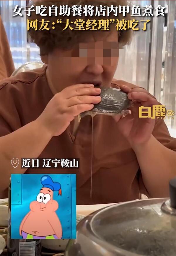 近日,辽宁鞍山的赵女士和家人一起吃自助餐时,发现姑姑煮熟并吃掉了店内的甲鱼,引起广泛关注。(据3月27日陕西网白鹿视频)