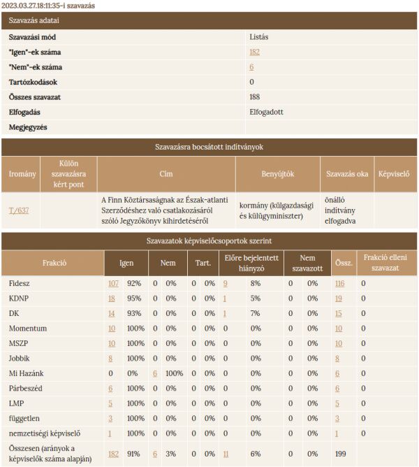 导读:当地时间3月27日,匈牙利议会举行投票批准了芬兰加入北约的申请。据报道,该决定以182票赞成、6票反对和11票弃权获得通过。