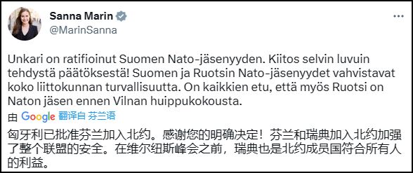 匈牙利国民议会通过草案后,芬兰总理桑娜·马林(Sanna Marin)发推感谢这一“明确决定”,表示“芬兰和瑞典加入北约加强整个联盟的安全。希望在维尔纽斯峰会之前瑞典也能加入,这符合所有人的利益。”