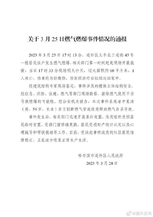 导读:日前,哈尔滨道外区发生燃气燃爆事件致1死多伤,3月28日,官方通报:死者割断燃气管道自杀,目前有关部门已开展善后处置。