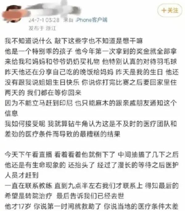 近日,中国羽毛球界传出一则令人心碎的消息——年仅17岁的国羽新星张志杰在印尼参赛期间不幸去世,这一悲剧迅速引发了广泛关注和热议。