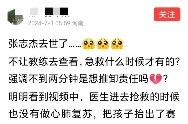 张志杰的姐姐对赛事组织方和医疗团队的救治效率提出了质疑。