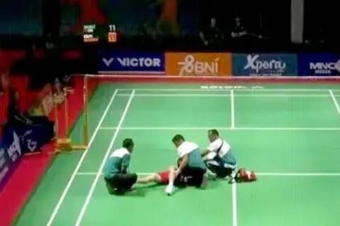 这位年轻的小将正在印尼参加亚洲羽毛球锦标赛,在与日本选手的比赛进行到第一局11:11时,突然倒地,全身抽搐,情况十分紧急。