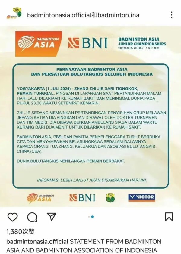 根据印尼羽毛球协会6月30日深夜发布的公告,张志杰于当天晚上23:20不幸离世。