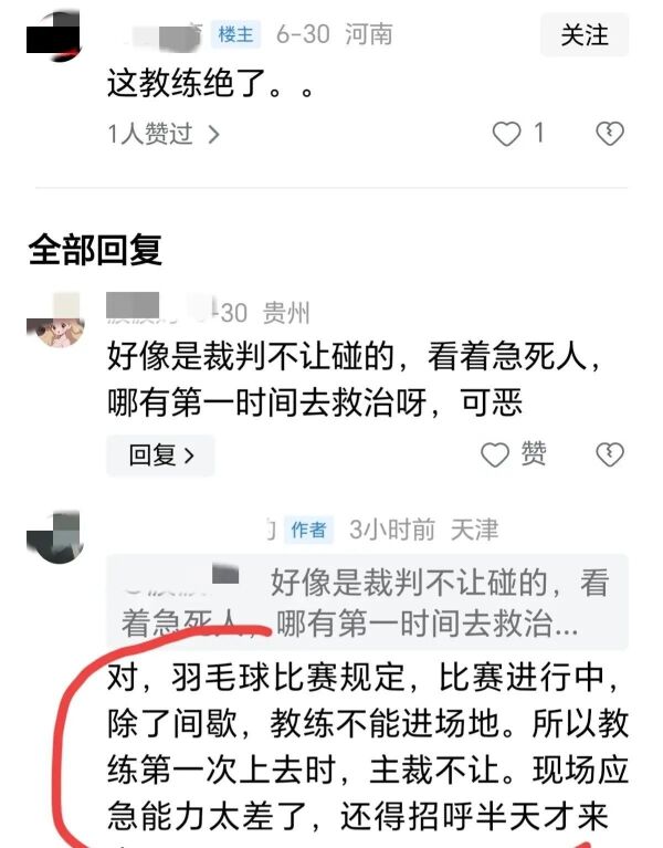 许多网友认为,张志杰倒地后,教练曾试图进入场内查看情况,但被裁判制止,迫使教练只能在场外焦急等待。