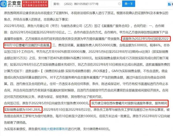 据企查查信息显示近日,长沙六月里文化传播有限公司与赤度企业发展(上海)有限公司服务合同纠纷案裁判文书公开。文书显示,2022年5月,原告六月里公司与被告赤度公司签订《直播推广服务合同》,合同约定:2022年5月6日起至2022年8月10日赤度公司邀请曹曦月为六月里公司直播带货,3个月直播销售额达15万元,六月里公司支付5.3万元,若未达标,赤度公司将按未达成比例退款。