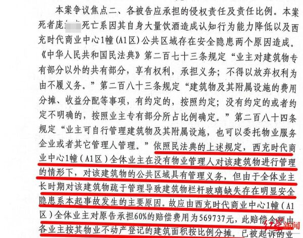 法院审理认为,女孩死亡系因其自身大量饮酒造成认知行为能力降低,以及西充时代商业中心1幢(A1区)公共区域存在安全隐患两个原因造成。商业中心全体业主在没有物业管理人对该建筑物进行管理的情形下,对该建筑物的公共区域具有管理义务。但由于全体业主长时期对该建筑物疏于管理导致建筑物栏杆玻璃缺失存在明显安全隐患,系本起事故发生的主要原因,故应由全体业主对原告承担60%的赔偿费用569737元,由各业主按其物业不动产登记的建筑面积按比例分摊。最终,法院确定,被起诉的87户业主按其物业建筑面积每平方米承担29元的赔偿责任,其赔偿金额在数百元到上万元不等。