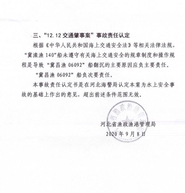 2020年9月,河北省渔政渔港管理局作出《12.12交通肇事案事故责任认定书》。该认定书的结论为:“冀滦渔140”船未遵守有关海上交通安全的规章制度和操作规程,是导致“冀昌渔06092”船翻沉的主要原因,应负主要责任;“冀昌渔06092”船负次要责任。