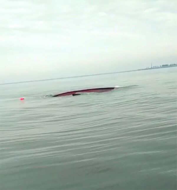 李洪军的渔船侧翻后,在海面露出部分船底。 本文图片均由受访者提供