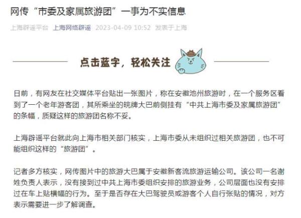 导读:日前,网友称安徽一旅游大巴悬挂“上海市委及家属旅游团”条幅,上海辟谣平台就此向相关部门核实,上海市委从未组织、也不可能组织这样的“旅游团”。