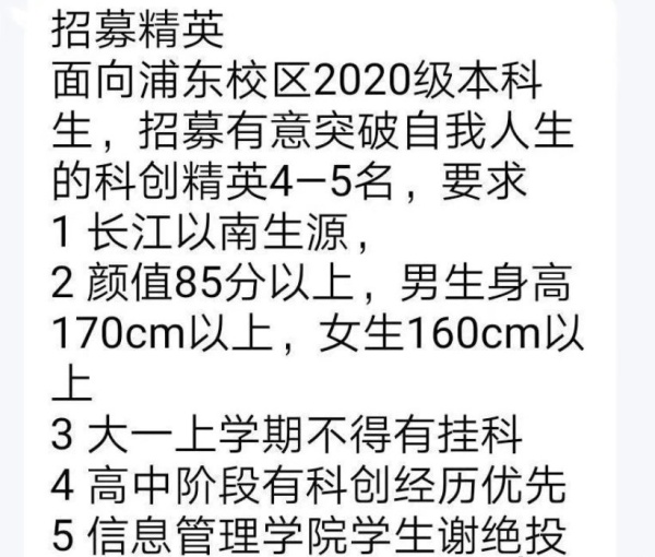 这份名为“面向浦东校区2020级本科生招募科创成员(精英)”的公告中写道:要求长江以南生源;颜值要求85分以上,男生身高170cm以上,女生160cm以上。