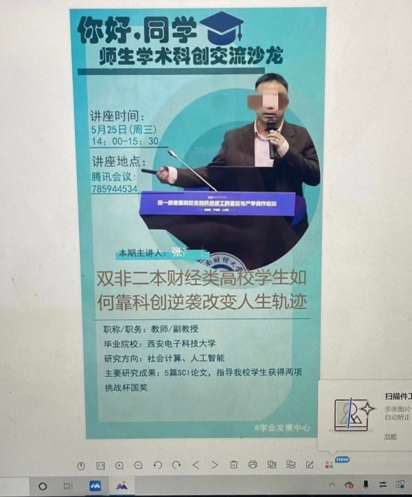 5月25日下午,立信学院电子商务系教师张某某进行了名为《双非二本财经类高校学生如何靠科创逆袭改变人生轨迹》的讲座。