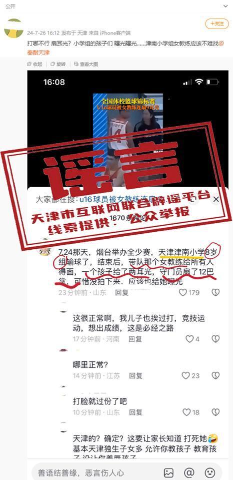 接网民举报,网上出现“津南小学8岁组输球后被带队教练掌掴”相关信息。经核实,2024年7月24日,天津市实验小学津南学校足球队在山东烟台大学举办的全国少年儿童足球联赛中,以3:2的比分取胜。关于“津南小学学生输球后被教练掌掴”传言为不实信息。网传信息引用图片与全国少年儿童足球联赛毫无关联。