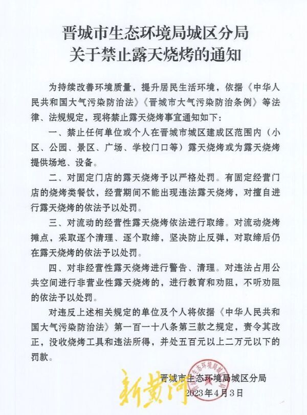 导读:近日,山西晋城市生态环境局城区分局发出通知,特别提出要求:流动的经营性露天烧烤、非经营性露天烧烤将依法进行取缔、清理。