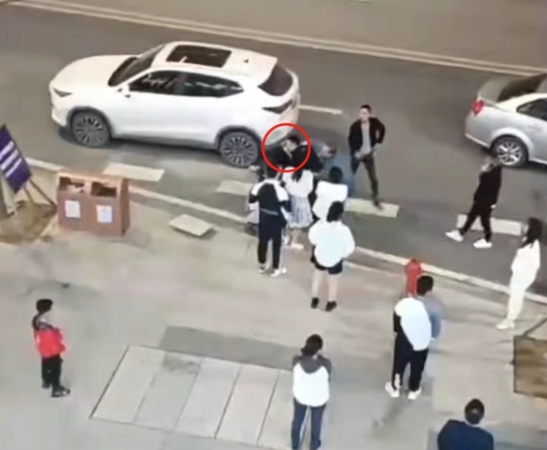 视频画面中,一白衣女子与黑色外套的男子发生冲突。女子将其假发扯下,男子暴怒起脚将女孩踹飞,女孩狠狠地摔倒在地上并撞到了身后的电动车,周围有不少人围观。