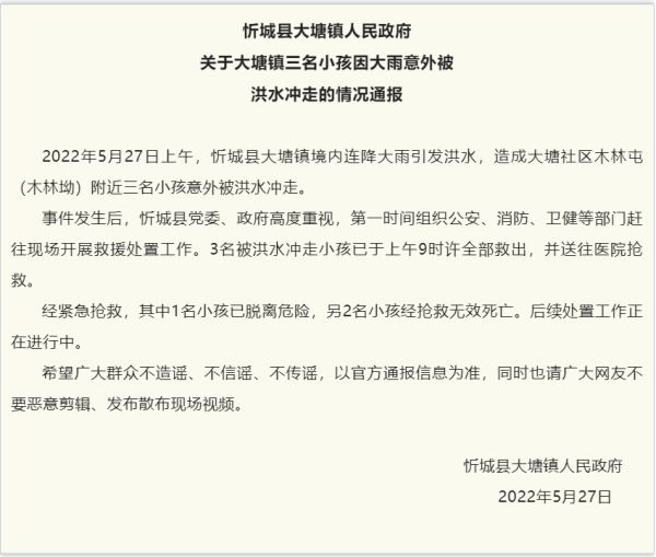 “忻城发布”微信公众号消息,广西忻城县大塘镇人民政府发布关于大塘镇三名小孩因大雨意外被洪水冲走的情况通报。