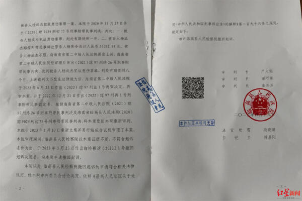 2023年4月19日,临高县法院就该案作出刑事裁定。裁定书显示,该院于2023年1月13日重新立案并另行组成合议庭审理了此案。审理期间,临高县检察院以该案证据不足,不符合起诉条件为由,于2023年3月23日作出临检撤诉【2023】1号撤回起诉决定书,向法院申请撤回起诉。