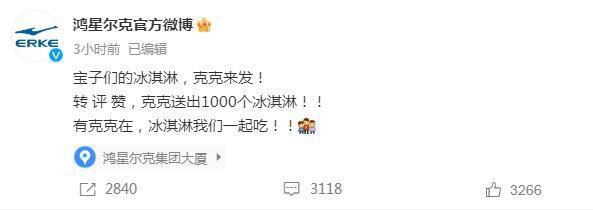 鸿星尔克请网友吃冰淇淋,网友评论:还是我们民族品牌大气!